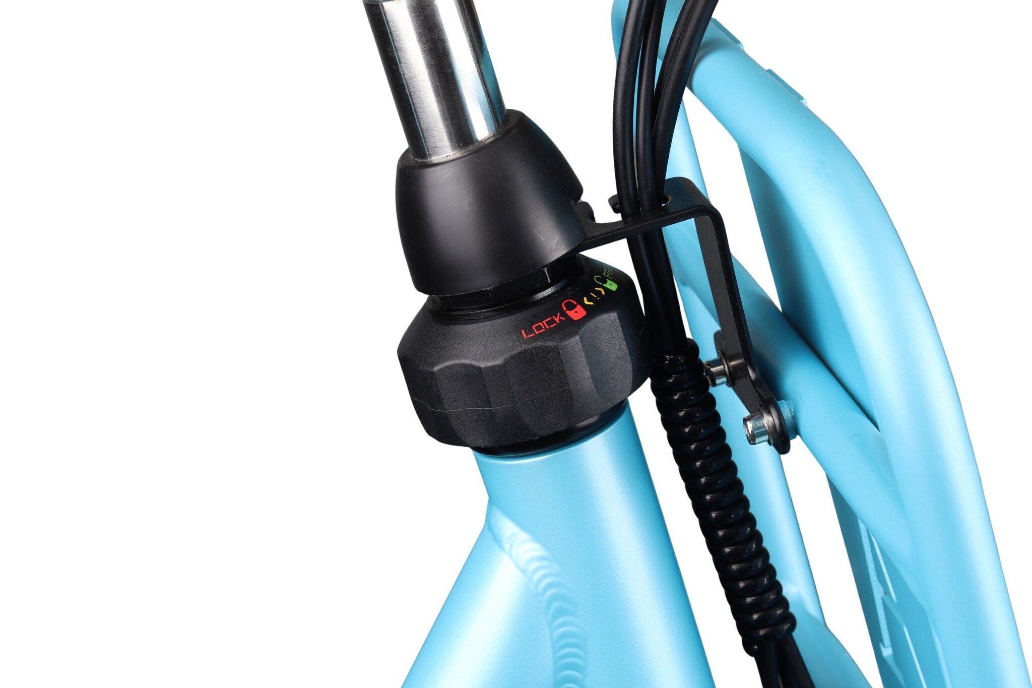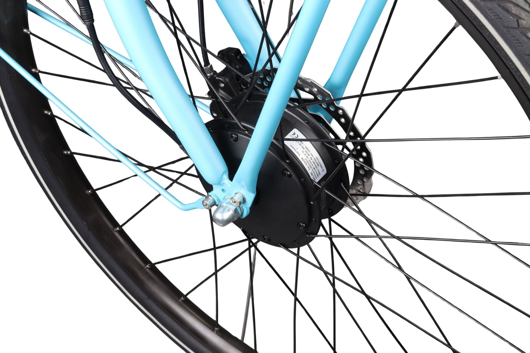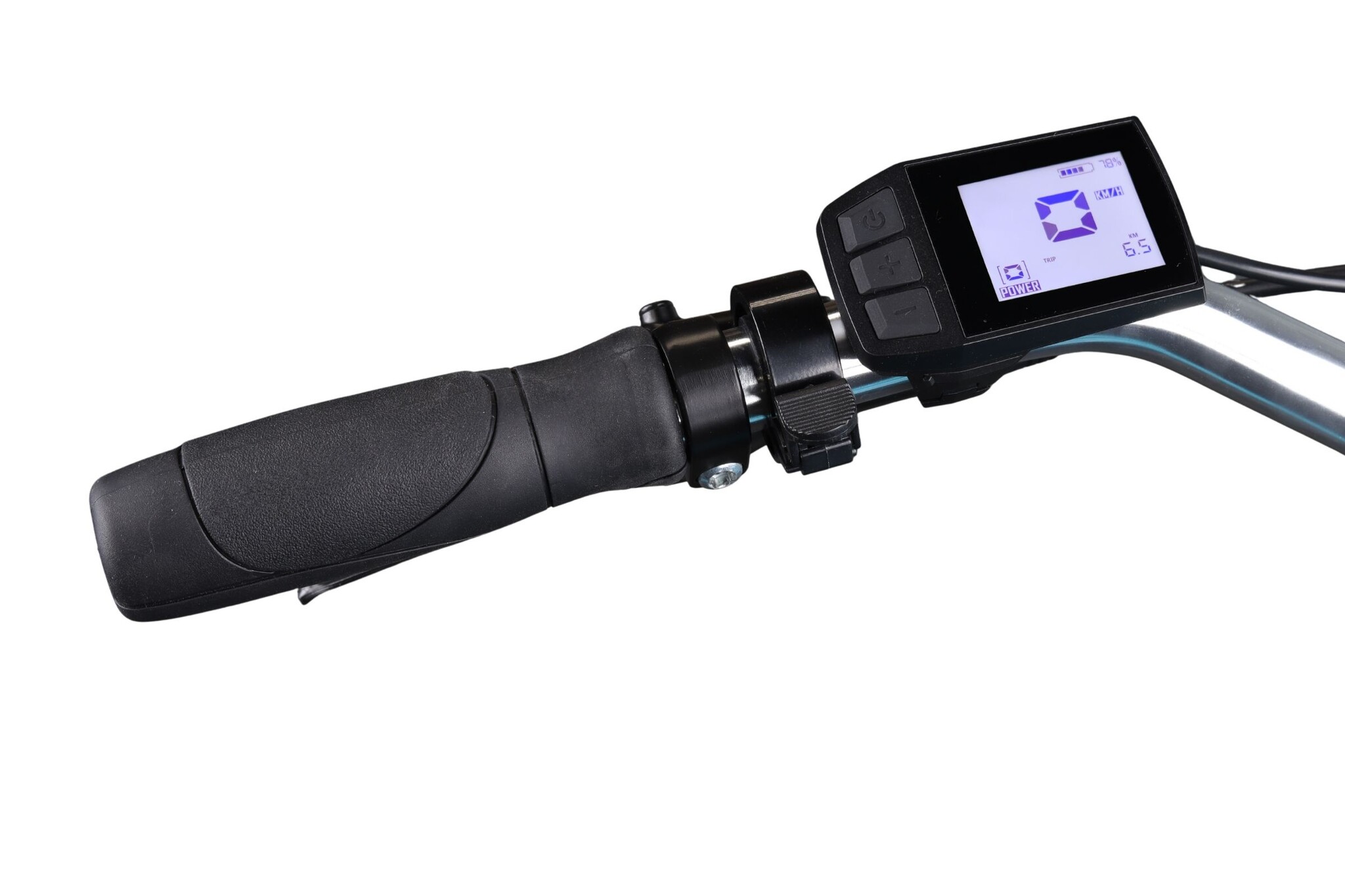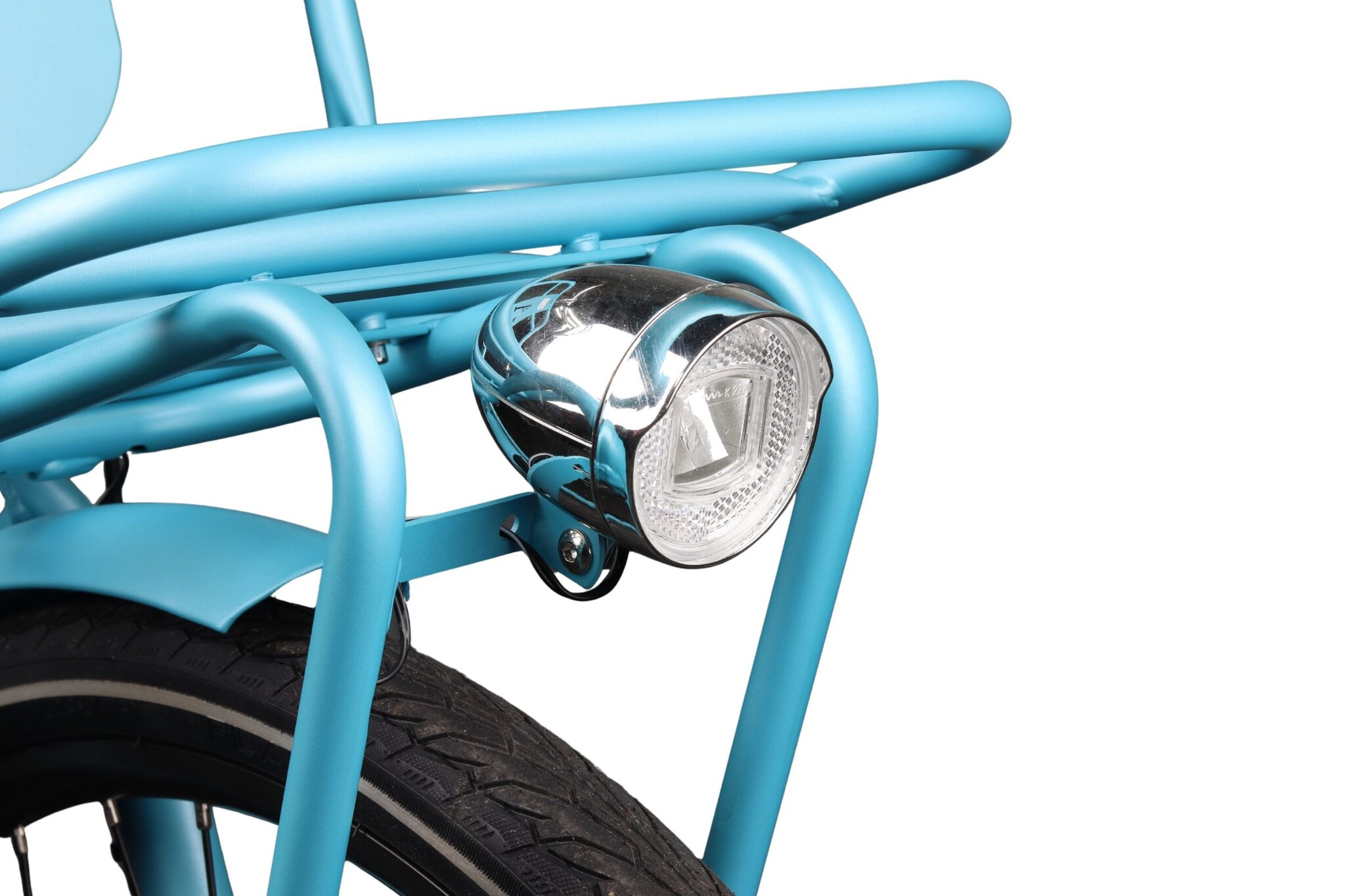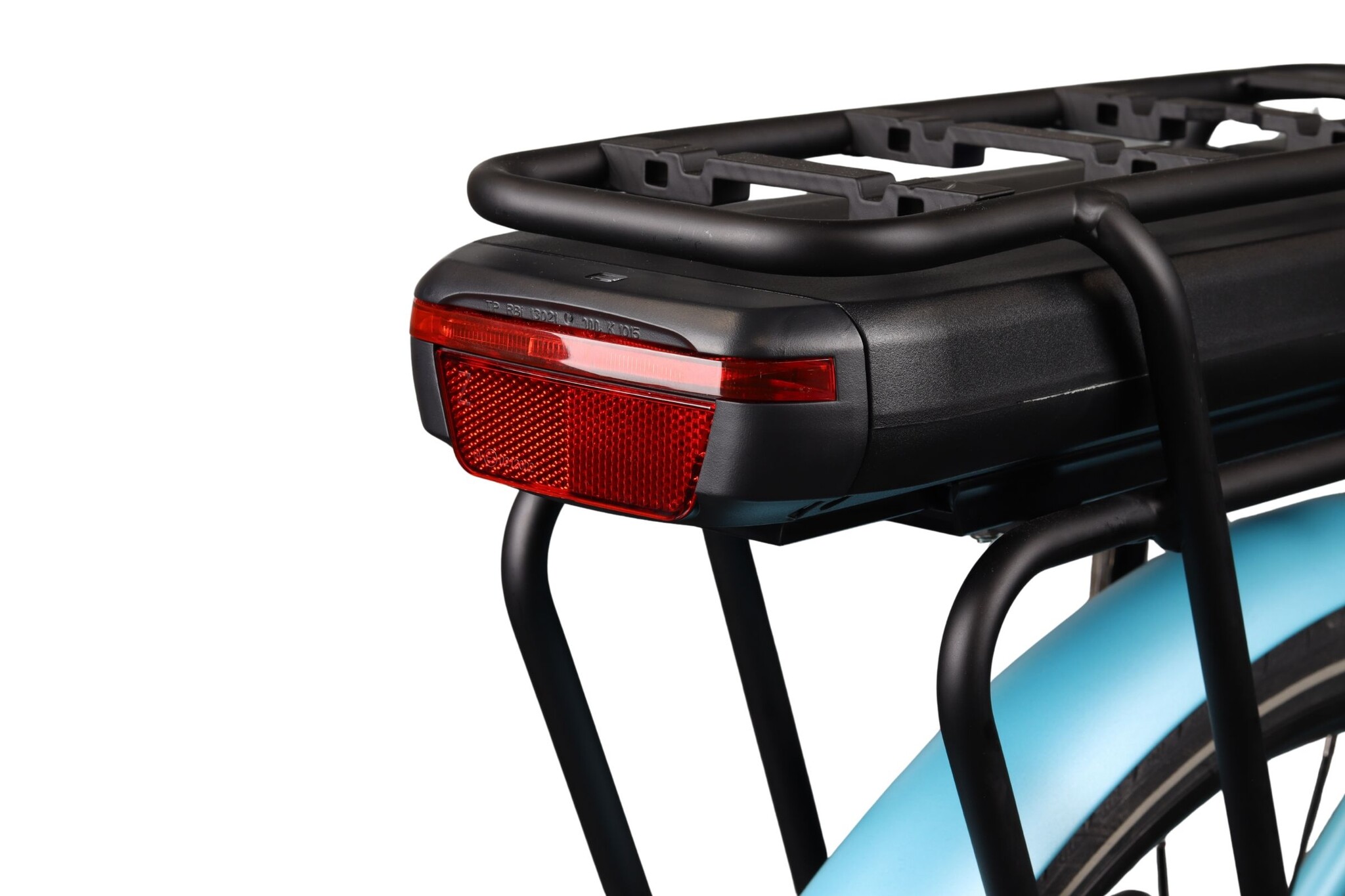 De voorwielmotor wordt aangestuurd via een digitaal display, waarmee je eenvoudig kiest uit vijf ondersteuningsstanden. Zo stem je de trapondersteuning af op jouw route of gewenste inspanning. Met hetzelfde display bedien je ook het achterlicht, terwijl de voorlamp onder de voordrager op batterijen werkt voor extra zichtbaarheid.